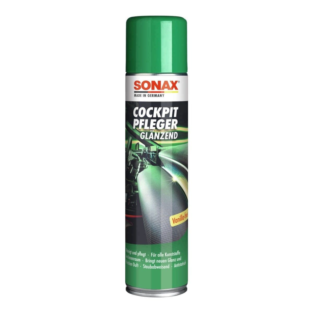 SONAX CockpitPfleger Glänzend почиства и поддържа всички пластмасови части в автомобила. Придава нов блясък и свеж аромат на ванилия на кокпита. Отблъсква прах, антистатичен е и предотвратява чупливостта на пластмасите. Подходящ е и за дървени арматурни панели. Без силикон.